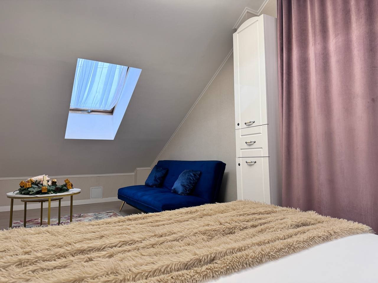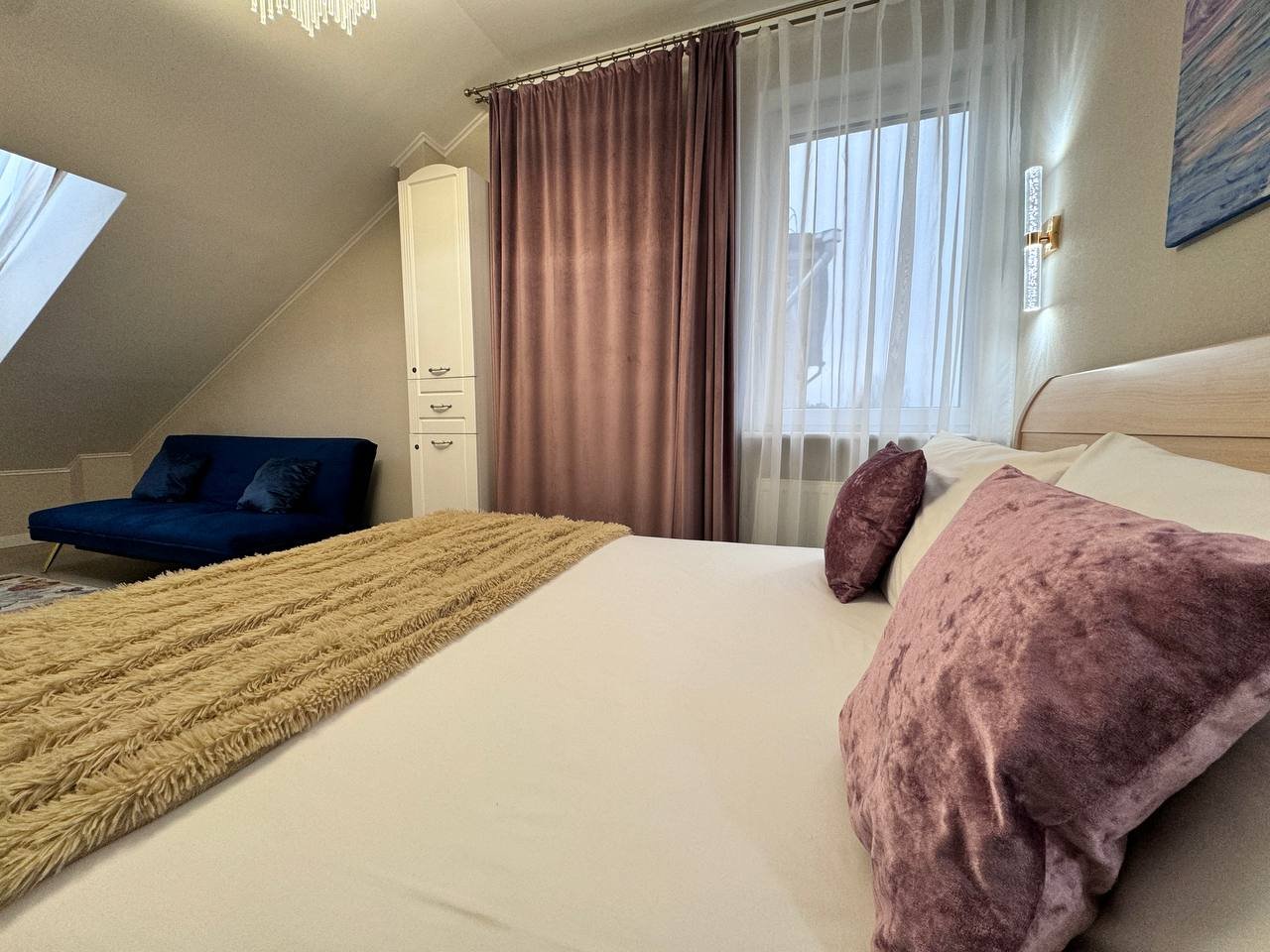 Спальня: двуспальная кровать (160×200 см) и раскладной диван-кровать (160×190 см)